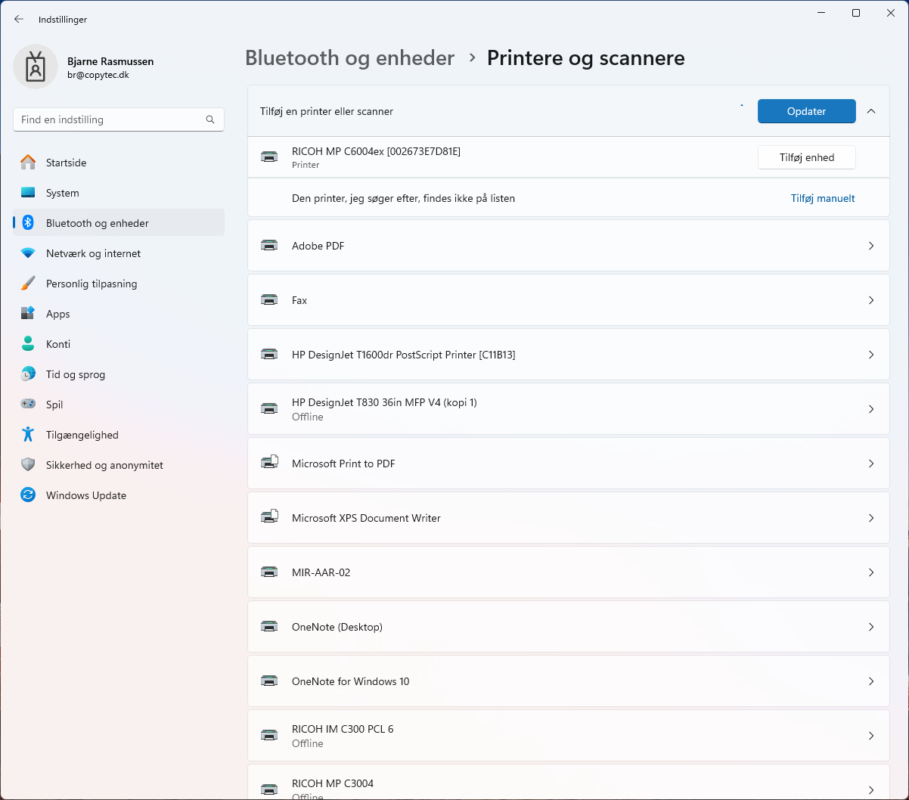 Hvis man har tilføjet printeren vil man bagefter kunne se at printeren nu hedder f.eks. Ricoh MP C6004ex [002673E7D81E]