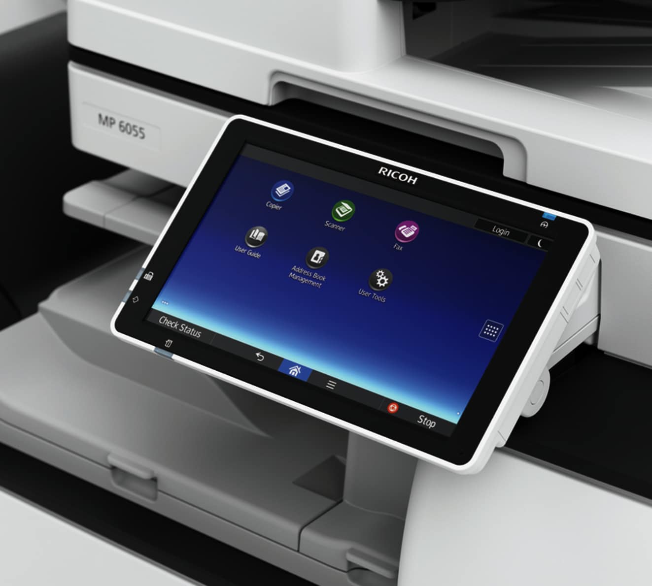 Ved hjælp af maskinens smarte touchpanel til betjening kan almindelige funktioner som scanning og kopiering udføres med et enkelt tryk. Desuden kan touchpanelet tilpasses til lige præcis jeres behov, så betjeningen bliver nem og effektiv.