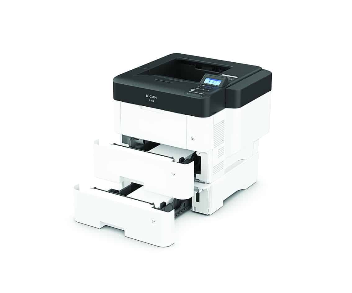 P800 fra Ricoh er en sort/hvid A4-printer, der passer til kontorer med et stort printbehov men lille kontorplads. Denne kompakte printer klarer selv komplekse opgaver med en høj hastighed.