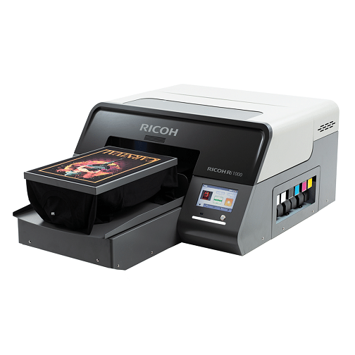 Ricoh Ri 1000 er en hurtig og effektiv DTG-printer, som gør det muligt at printe både store og små oplag i høj printkvalitet på både lyse og mørke stoffer.