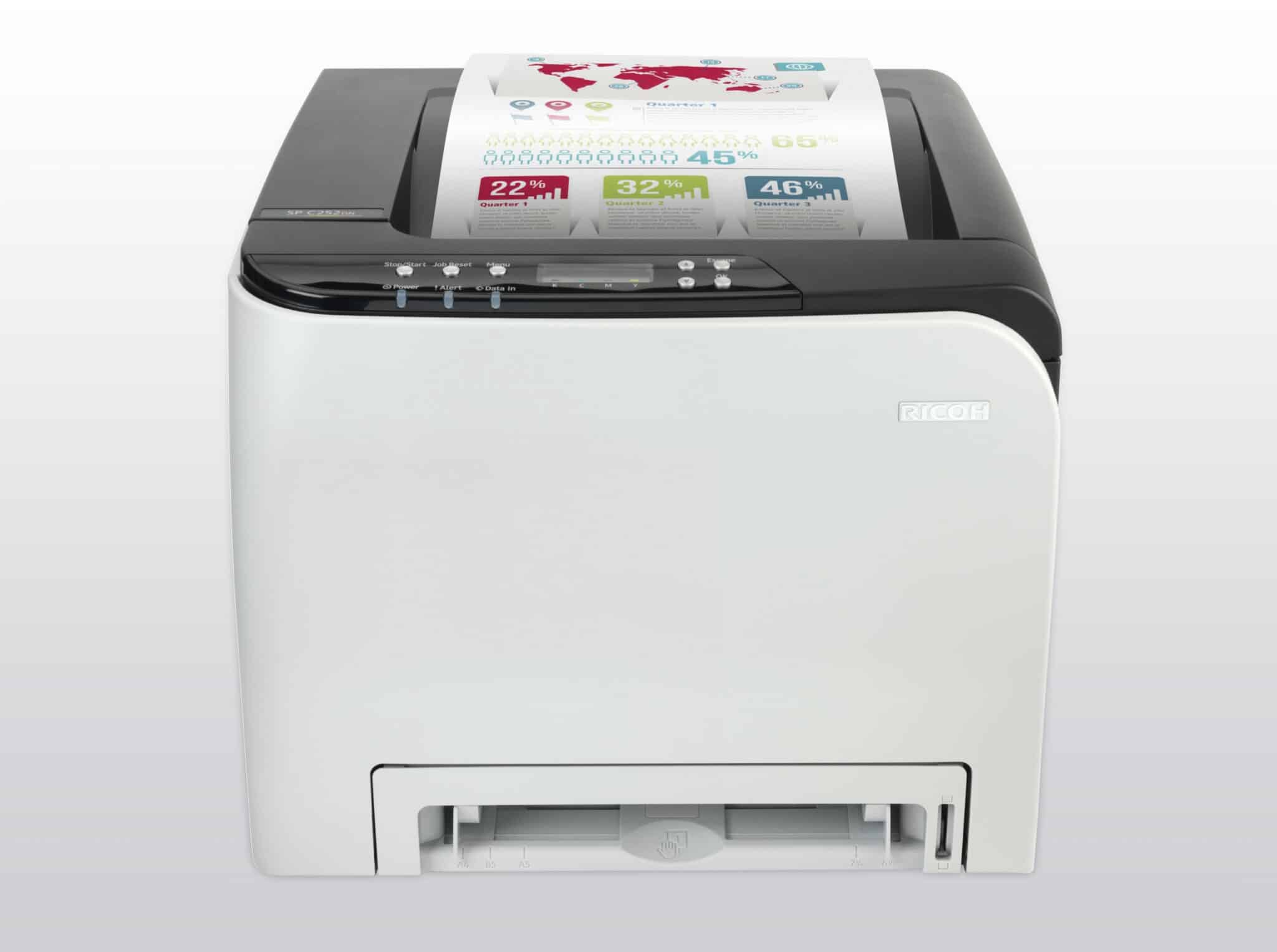 Ricoh SP C252 kan både sættes til kablet og trådløst netværk og er desuden kompakt designet. Ricoh SP C252 er derfor ideel til små virksomheder og kontormiljøer.